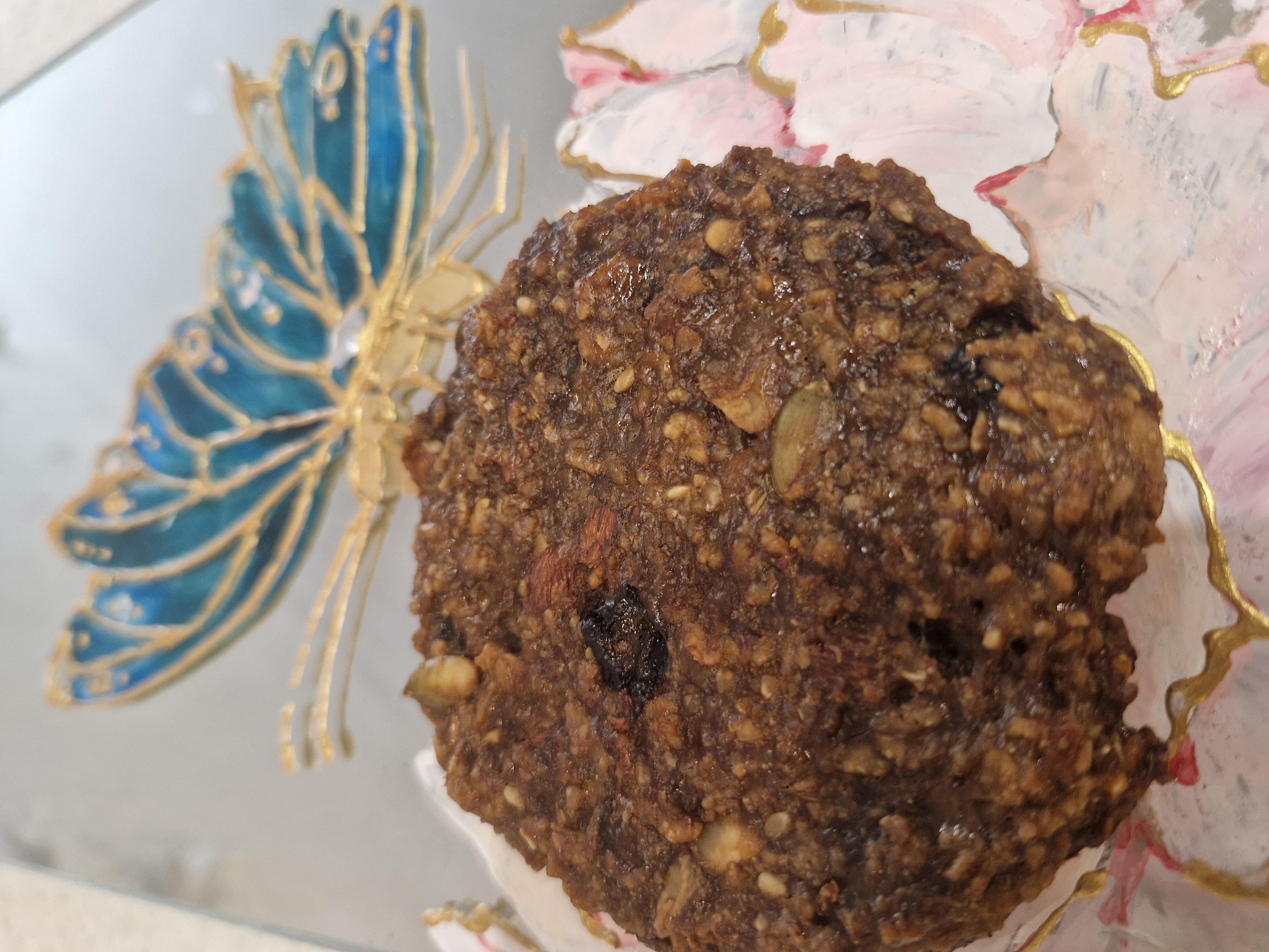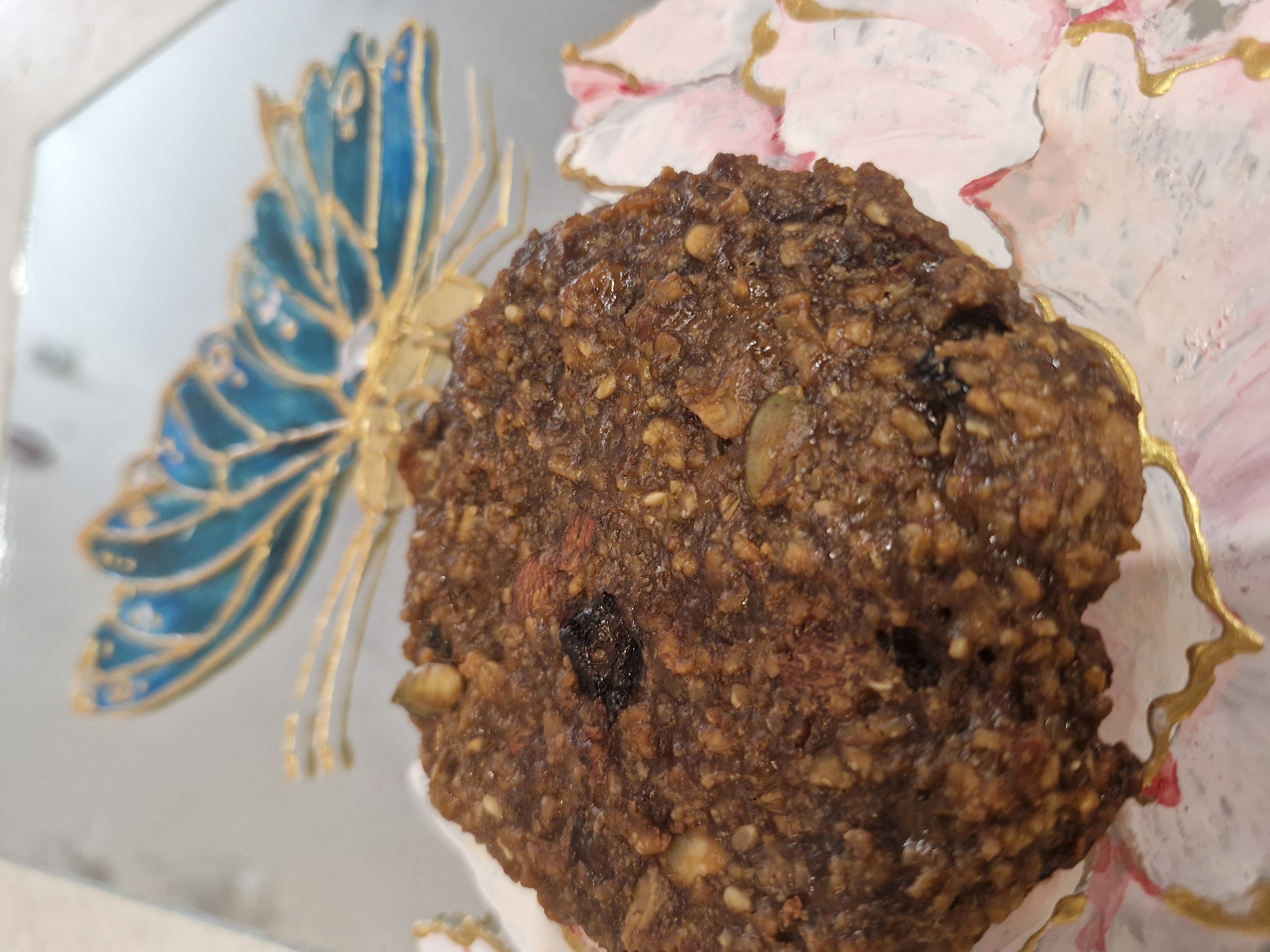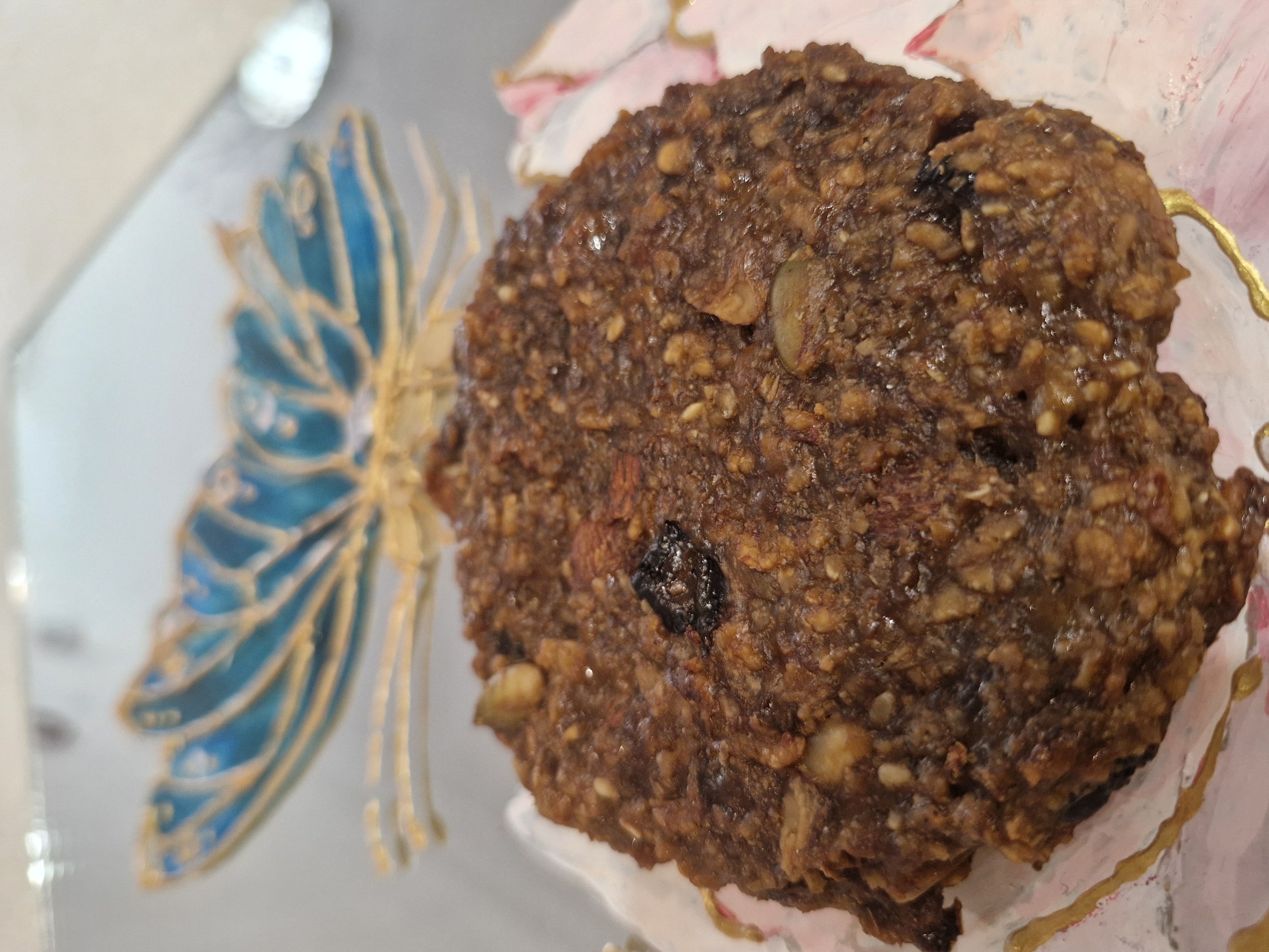 کوکی رژیمی تهیه شده از جو دوسر پرک.کره بادام زمینی.موز بادام .تخم کدو و مویز و شیره خرما و دارچین.. در یخچال 2 روز در فریزر یک ماه به صورت گرم سرو میشود.
